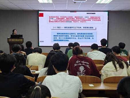 王丽首先讲述对马克思主义世界观和方法论的坚持和发展、对中国共产党百年奋斗实践及其历史经验的科学总结和对中华优秀传统文化的传承发扬是习近平新时代中国特色社会主义思想的世界观方法论的理论之源;随后王丽分享了“六个坚持”的具体内涵和内在逻辑和现实价值,她说“六个坚持”是内在统一、相互贯通的有机整体,贯穿着马克思主义的基本立场观点方法,是习近平新时代中国特色社会主义思想活的灵魂;最后她指出,学习习近平新时代中国特色社会主义思想要知行合一。“知之”需全面系统学习,读原文悟原理;“信之”要深刻理解,结合历史与现实坚定理想信仰;“行之”则是将党的二十大精神与实际的学习生活工作相结合。
