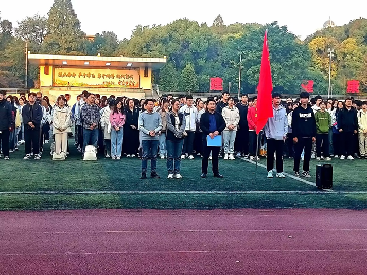 在东校区田径场举行秋季学期升旗仪式。学院党委副书记杨会军,学工办主任刘敬敏,辅导员严瑾、周学素和2021级、2022级本科生参加升旗仪式。