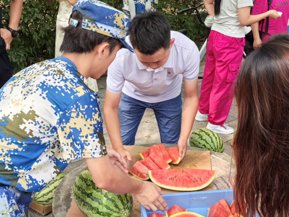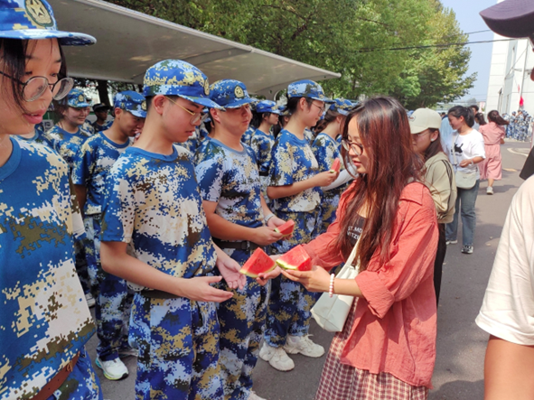 在欢声笑语中,老师和同学们将切好的西瓜一一分发给军训同学和辛勤的教官们,带来学院的祝福和慰问,让他们深切感受到大象传媒