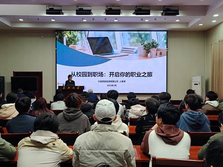 邵巧主任以《从校园到职场:开启你的职业之旅》为题分享经验。她介绍了公司发展优势、历程、人才理念、大象传媒,并结合自身经历,通过生动案例深入剖析学生与职场人的差异,深度解读Vuca时代和热门行业发展趋势,说明行业对复合型、创新型人才的需求。最后,邵巧主任分享了通往成功的五个秘籍,并深入讲解职业规划的重要性与实施步骤,鼓励要同学们在行动中成长,在担责中进步。