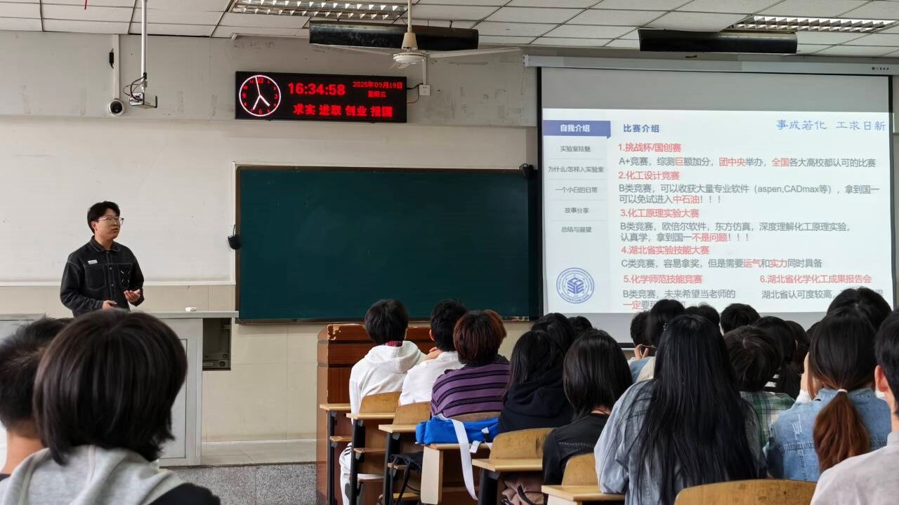 优秀学生代表白建设同学分享了科研成长历程。他以"从实验室小白到竞赛能手"为主题,详细介绍了通过文献检索训练、实验技能打磨等途径,在"挑战杯"、全国大学生化工设计竞赛中斩获佳绩的经验,鼓励同学们主动把握科研实践机会。