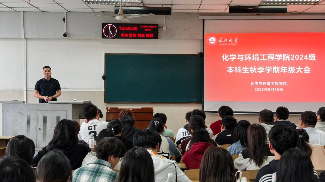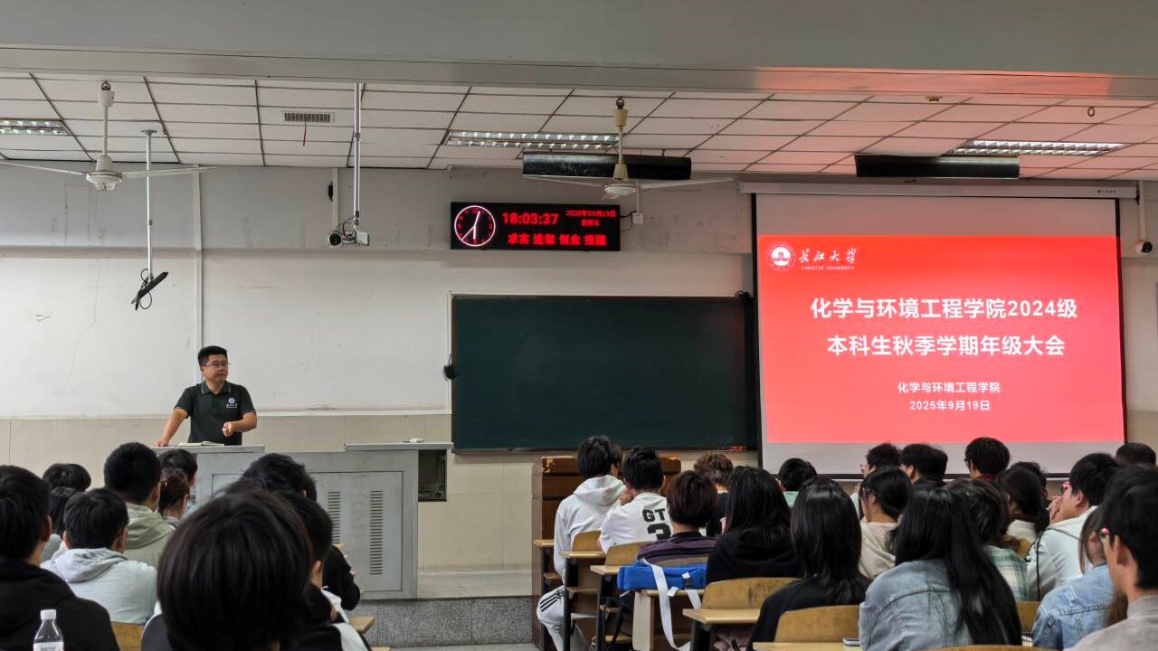 于12教202召开2024级本科生年级大会。本次大会由辅导员蔡略主持,学院党委副书记杨会军、环工系王国保老师、应化系王腾飞老师、储能系张春燕老师及2024级全体本科生共同参会。