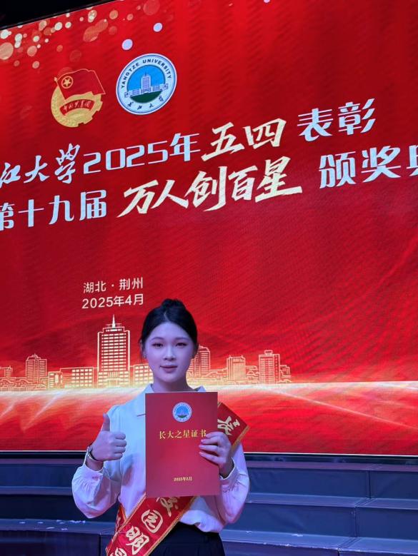齐心协力,点燃集体星火。担任团支书三年,她始终积极参与班级建设,所在班级先后5次荣获“标兵班集体”、"活力团支部”等荣誉称号,期间培养发展2名共青团员。个人因表现突出,2次获评“优秀团支书”,并荣获“优秀共青团干部”“优秀学生干部”等称号。作为学院2022级朋辈导师,她以“传帮带”的方式悉心指导新生适应大学生活,用实际行动发挥了学生骨干的示范引领作用。