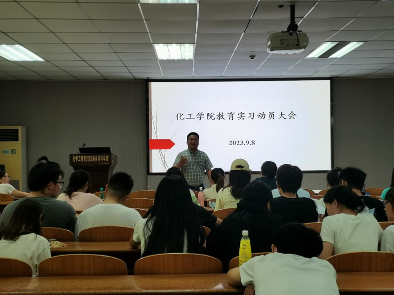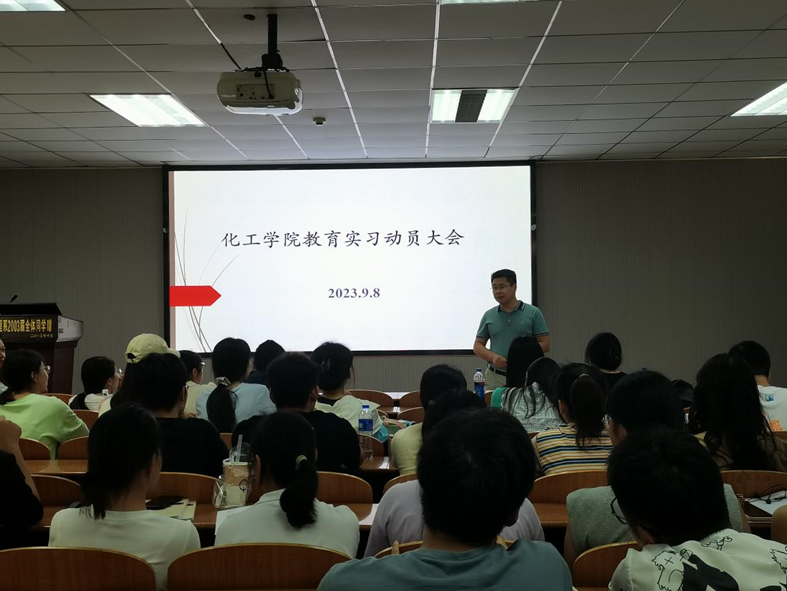 于东校区14教北201召开2020级化学师范生教育实习动员大会。副院长吴爱斌、党委副书记杨会军,化学系舒文明、刘华荣、童金强等老师共同参会。