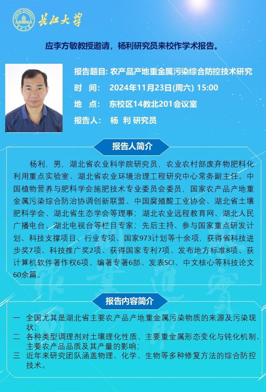 长江化工讲坛:农产品产地重金属污染综合防控技术研究