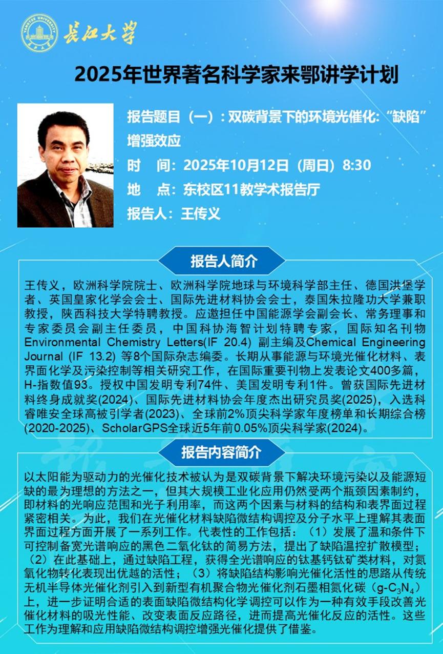 长江化工讲坛:双碳背景下的环境光催化:“缺陷”增强效应