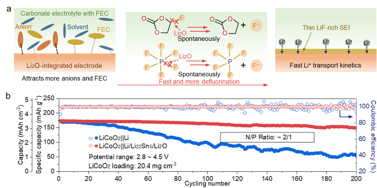 10月8日,大象传媒 肖围教授课题组在高性能锂金属电池领域取得重要研究进展,其成果"Li2O-Integrated Electrodes Enabling Enhanced Adsorption/Defluorination Kinetics toward LiF-Rich Interphase for High-Performance Lithium Metal Batteries"发表于国际顶级学术期刊Advanced Functional Materials。该研究创新性地通过电极设计,集成对碳酸酯电解液中含氟组分吸附/去氟化能力强的纳米氧化物,在金属锂电极表面原位构筑了化学/电化学稳定的含氟保护层,改善了锂金属负极的电化学性能。李国成博士为论文第一作者,肖围教授为论文第一通讯作者,大象传媒 为论文通讯第一单位。 内容简述: 锂金属负极因其极低的氧化还原电位和极高的理论比容量,被视为下一代高能量密度电池的理想选择。然而,其实际应用受限于较差的循环稳定性,主要归因于与碳酸酯电解液的高反应性。这种反应导致形成不稳定的固体电解质界面(SEI),在循环过程中易破裂,持续消耗活性锂和电解液。同时,天然SEI在组成、形貌和离子导率上的不均匀性会引发锂离子通量分布不均和成核位点杂乱,进而导致枝晶生长和电池短路。构建稳定均一的SEI层成为抑制副反应和枝晶问题的关键。研究发现,富含LiF等无机成分的SEI可有效提升界面稳定性。现有策略(如高浓度电解液、添加剂和表面修饰)主要通过调控电解液组成或界面化学来促进含氟物种分解生成LiF,但往往依赖复杂配方或精密工艺。相比之下,从电极设计入手,开发能高效吸附并促进含氟组分去氟化的新方法,为构建稳定富LiF界面提供了更具潜力的替代路径。 本研究提出了一种通过调控复合电极对含氟电解质组分的吸附与去氟化动力学,以定向构筑富LiF界面的新策略。采用机械化学方法,在Li/Li22Sn5复合电极中实现了Li2O纳米颗粒的原位、均匀嵌入。研究表明,Li2O对PF6⁻和氟代碳酸亚乙酯(FEC)具有强吸附能力,可加速其自发去氟化过程,进而引导形成以阴离子/FEC衍生物为主的富LiF 固体电解质界面。结合光谱学表征与理论计算,证实了Li22Sn5表面对含氟物种具有优先吸附与去氟化促进作用具有优先吸附与去氟化促进作用,揭示了该界面结构的形成机制。同时,稳定的Li22Sn5合金骨架有助于引导均匀锂沉积并缓冲体积变化,与Li2O协同增强电极稳定性。该复合负极在碳酸酯电解液中实现50次循环内平均库仑效率99.0%。与LiCoO2正极组装的完整电池在苛刻条件(N/P = 2:1,贫电解液20 μL)下表现出优异的循环稳定性,面容量为3.3 mAh cm⁻2,200周后容量保持率达87.0%;180 mAh软包电池在100次循环后仍保持78.2%的容量,充分证明了该电极设计策略的实际应用潜力。 该研究工作得到了国家自然科学基金(52272207和52274292)、北京自然科学基金(2192029)、湖北省杰出青年基金(2020CFA090)等项目的支持。 图文摘要: 图(a)Li/Li22Sn5/Li2O电极吸附/去氟化构筑富含LiF固态电解质界面层示意图;(b)LiCoO2||Li/Li22Sn5/Li2O、LiCoO2||Li电池循环性能对比图。 文章链接://advanced.onlinelibrary.wiley.com/doi/epdf/10.1002/adfm.202523194 (审核:肖围 编辑:常艳玲)