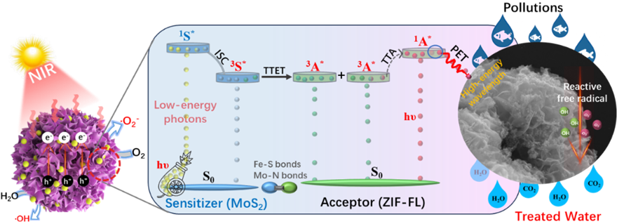 针对这一问题,罗霄副教授课题组提出并构建了基于MoS2与ZIF-FL的TTA-UC异质结光催化体系。该体系可将近红外光能量上转换至蓝紫光区,实现能量的有效放大。该异质结体系具有显著的反斯托克位移(0.86 eV),并通过Mo-N与Fe-S界面键合作用实现高效的三重态-三重态能量传递。当有机污染物存在时,体系可通过TTA过程将能量上转换,并原位传递给反应物而非发射光子,不仅大幅降低能量再吸收损耗,而且实现了真正意义上的低能光驱动光催化反应。值得一提的是,即使在仅有5–10 ℃的低温条件下,体系对盐酸四环素仍能实现85.4%的高去除率,充分验证了“能量放大器”概念的有效性与普适性。该成果为光催化材料在弱光条件下的高效利用提供了新路径,也为清洁能源转化与污染治理领域的深入研究开辟了新方向。